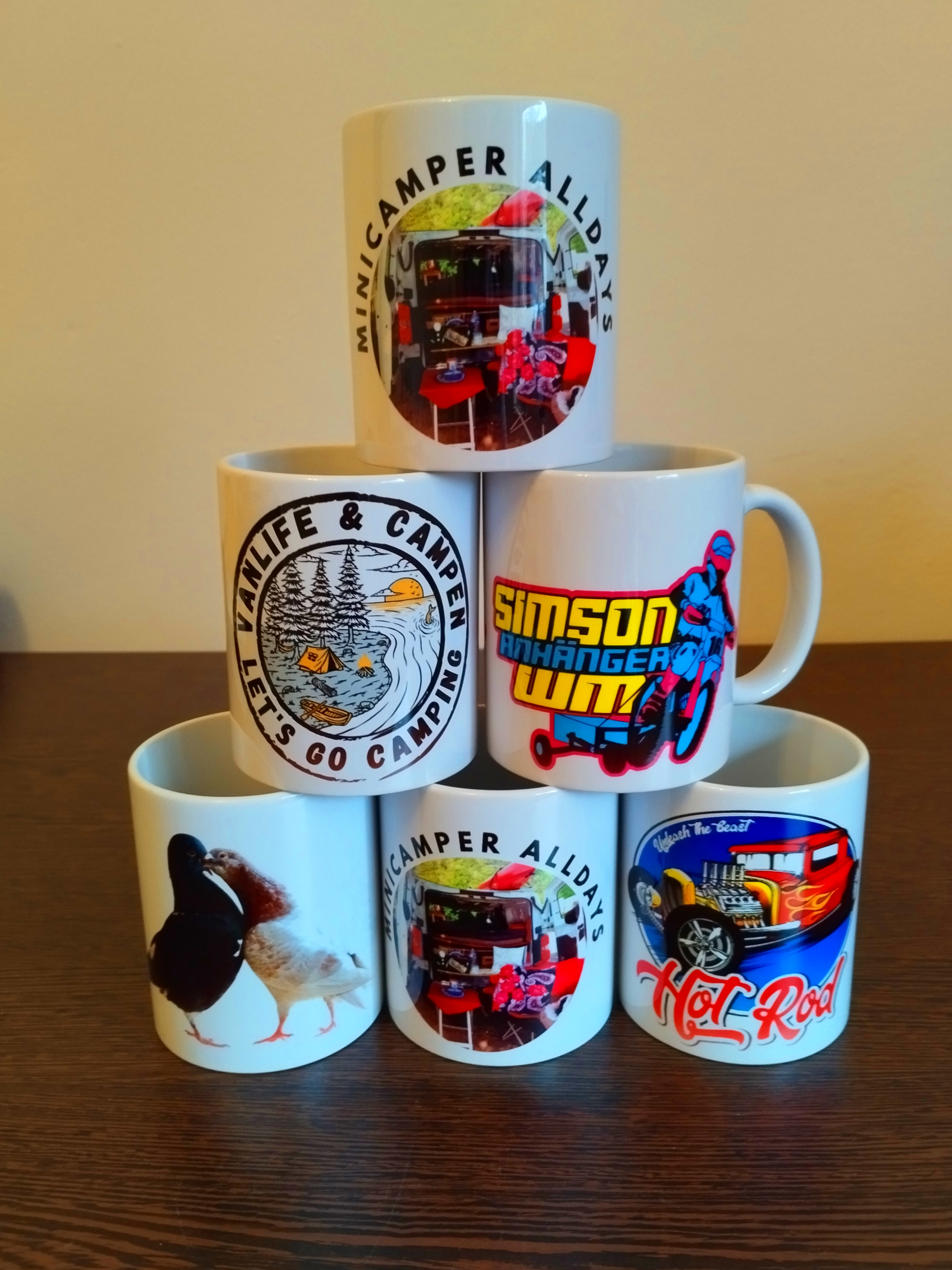 Egal ob Tassen, Becher oder Gläser, ich biete Dir hier eine Vielzahl an Möglichkeiten, Deine individuellen Grafiken zu präsentieren.